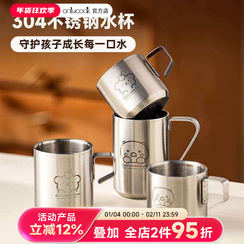 onlycook儿童304不锈钢水杯家用牛奶杯幼儿园宝宝食品级双层杯子