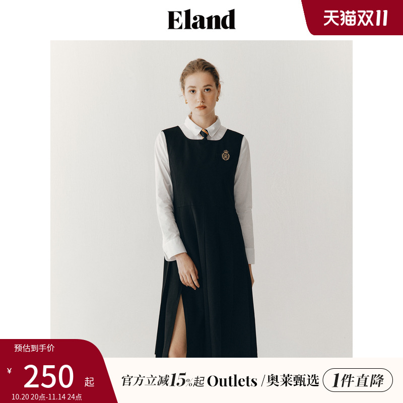 【Eland奥莱】衣恋连衣裙女中长款学院风方领无袖过膝裙子女秋冬