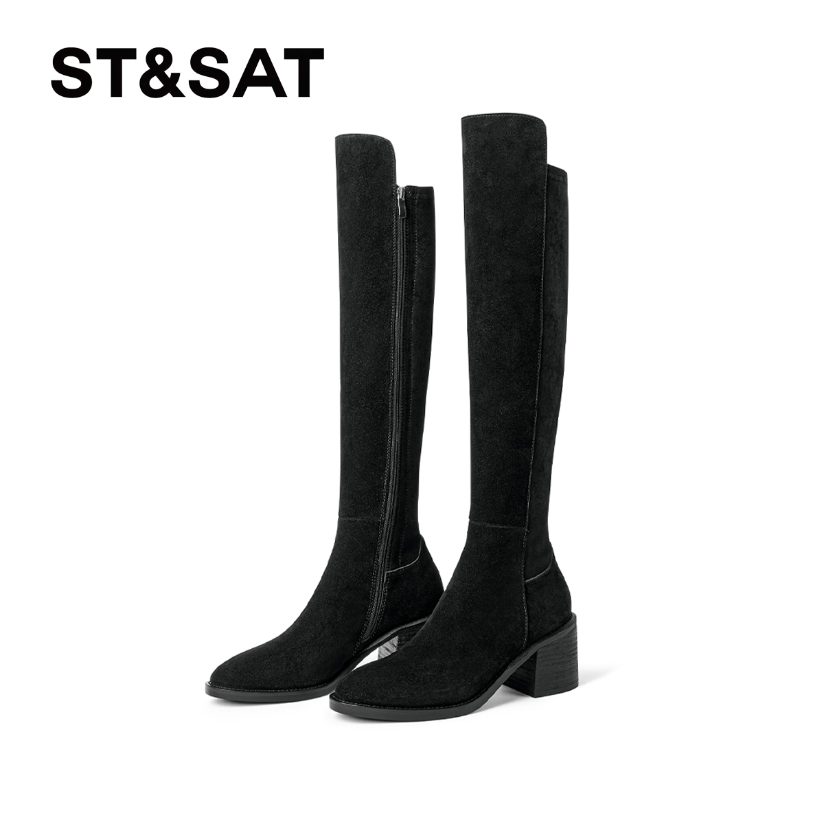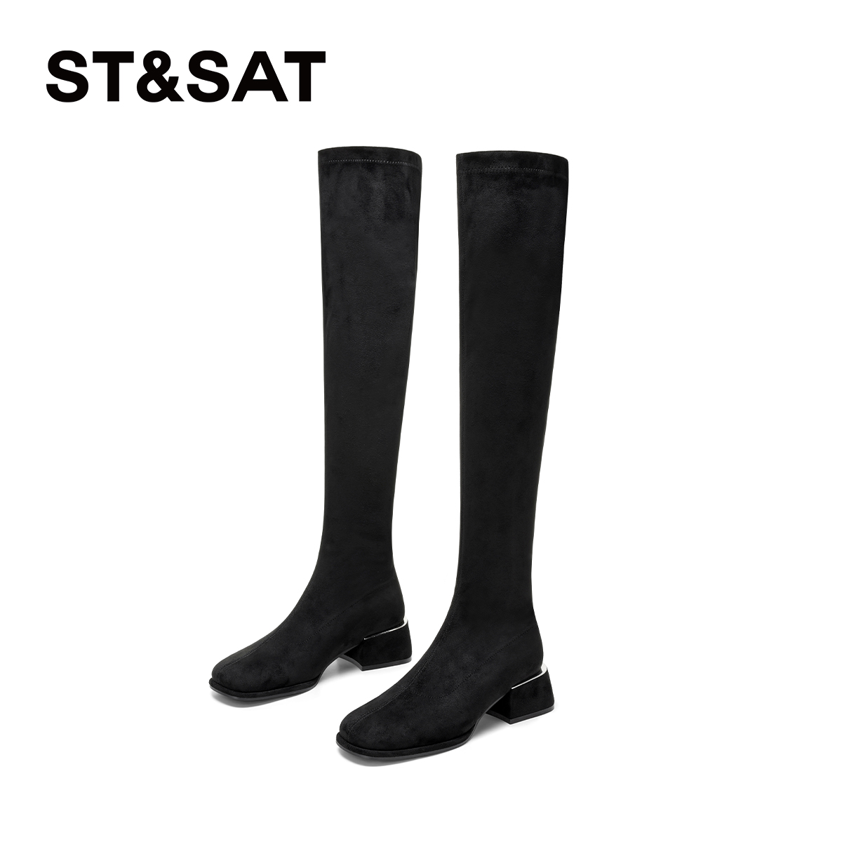 星期六粗跟过膝长筒靴2025新款秋冬黑色靴子女弹力瘦瘦靴高筒长靴