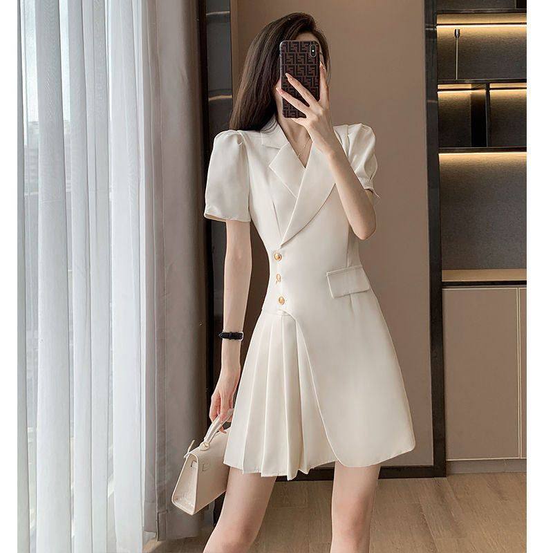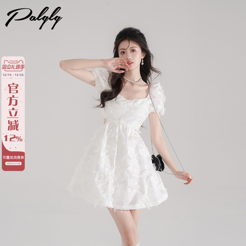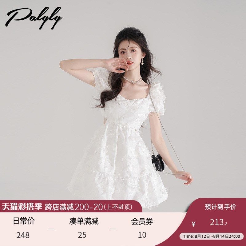 法式白色一字肩抹胸泡泡袖连衣裙女夏季新款纯欲风生日礼服短裙子