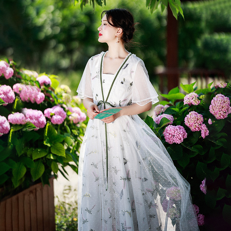 - 刺绣欧根纱连衣裙女