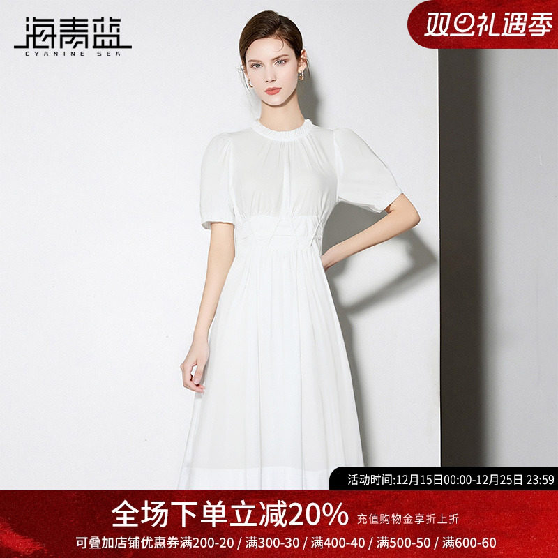 海青蓝 白色连衣裙夏女2025新款女装褶皱高级时尚气质中长款裙子