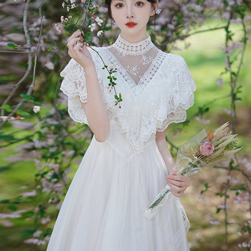 速发复古温柔在子气质超仙法蕾仙逃公主白色连衣裙夏式丝网纱长裙