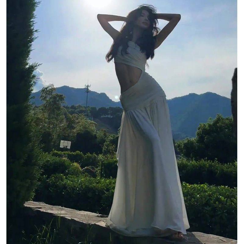 今年流行小众设计高冷御姐风修身背心露腰高级感褶皱白色连衣裙夏