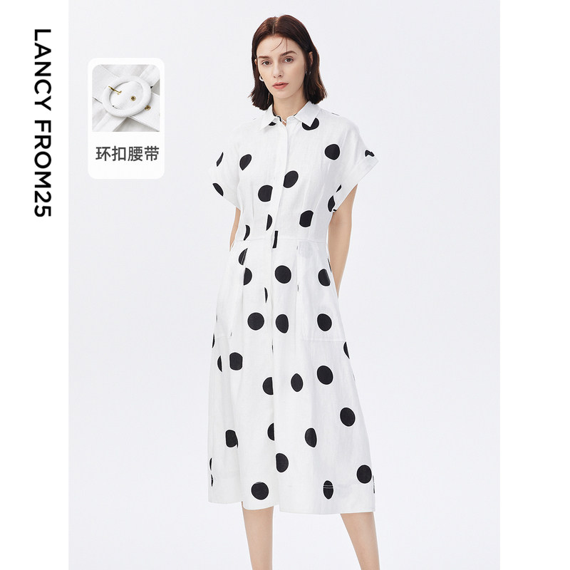【明星同款】朗姿亚麻法式中长款波点印花白色连衣裙夏新款裙子女