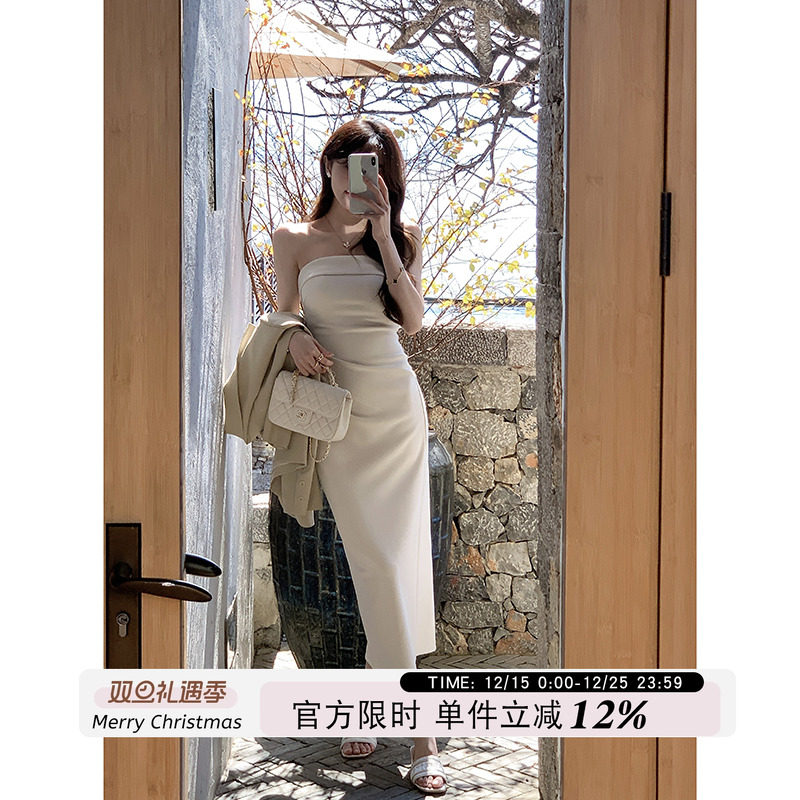 愉悦愉悦 收腰抹胸白色连衣裙女夏季绝美性感法式气质吊带包臀裙