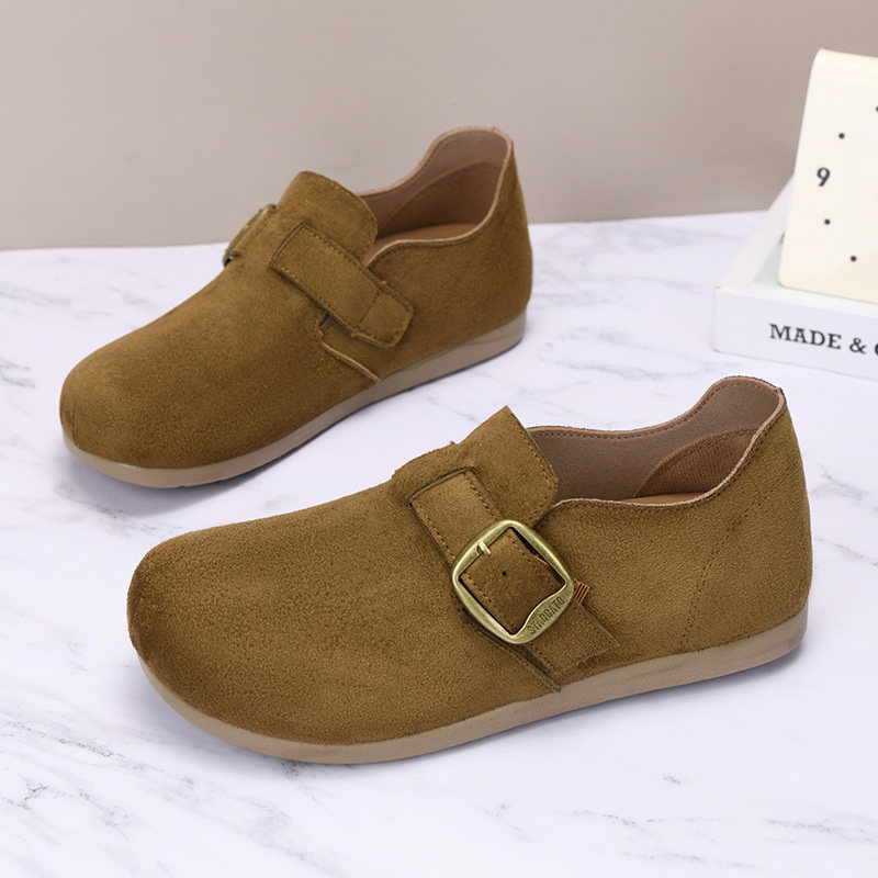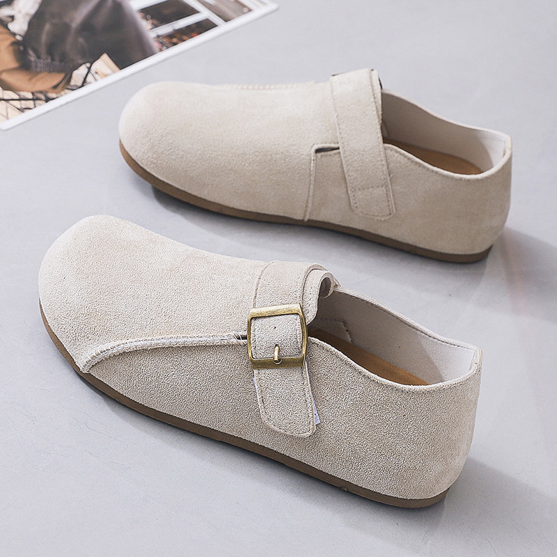2026春秋河南桑坡村百搭皮带扣勃单鞋女士真皮博肯软木休闲豆豆鞋