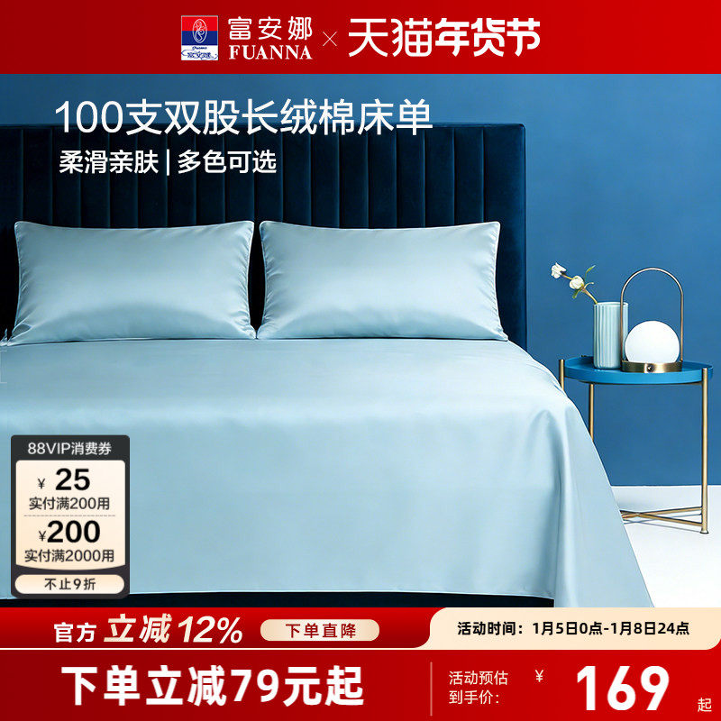 富安娜家纺100支长绒棉单件床单纯棉全棉单件简约贡缎床单床品
