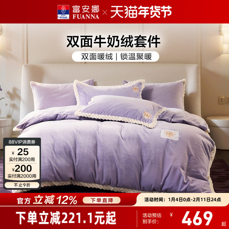 富安娜家纺牛奶绒四件套法兰绒被套床单珊瑚绒床上用品秋冬三件套