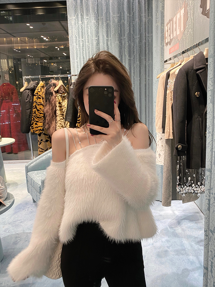 ITSNIKAR貉子毛领针织开衫女秋冬复古毛衣外套性感打底衫修身上衣