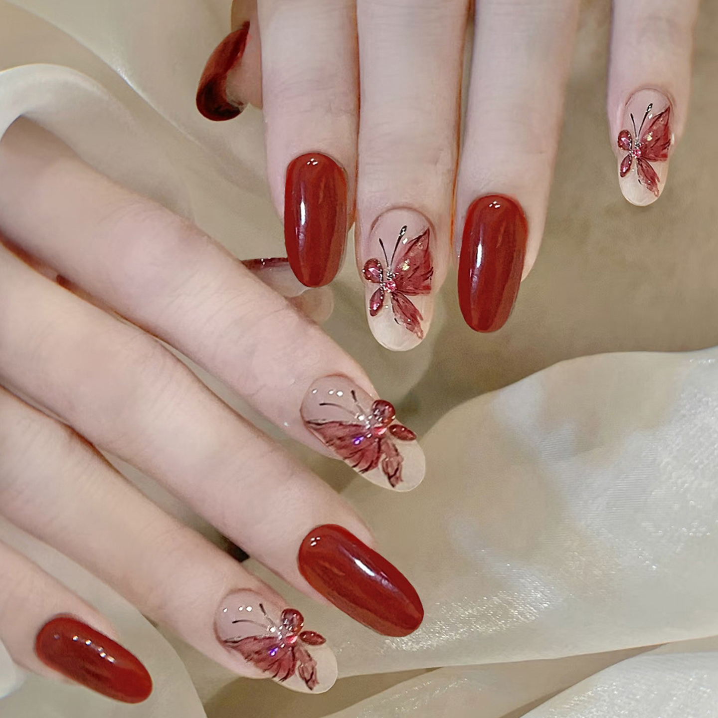 红舞蝶飞穿戴甲过年喜庆假指甲舞蹈拍照中国古风新款可卸美甲贴片
