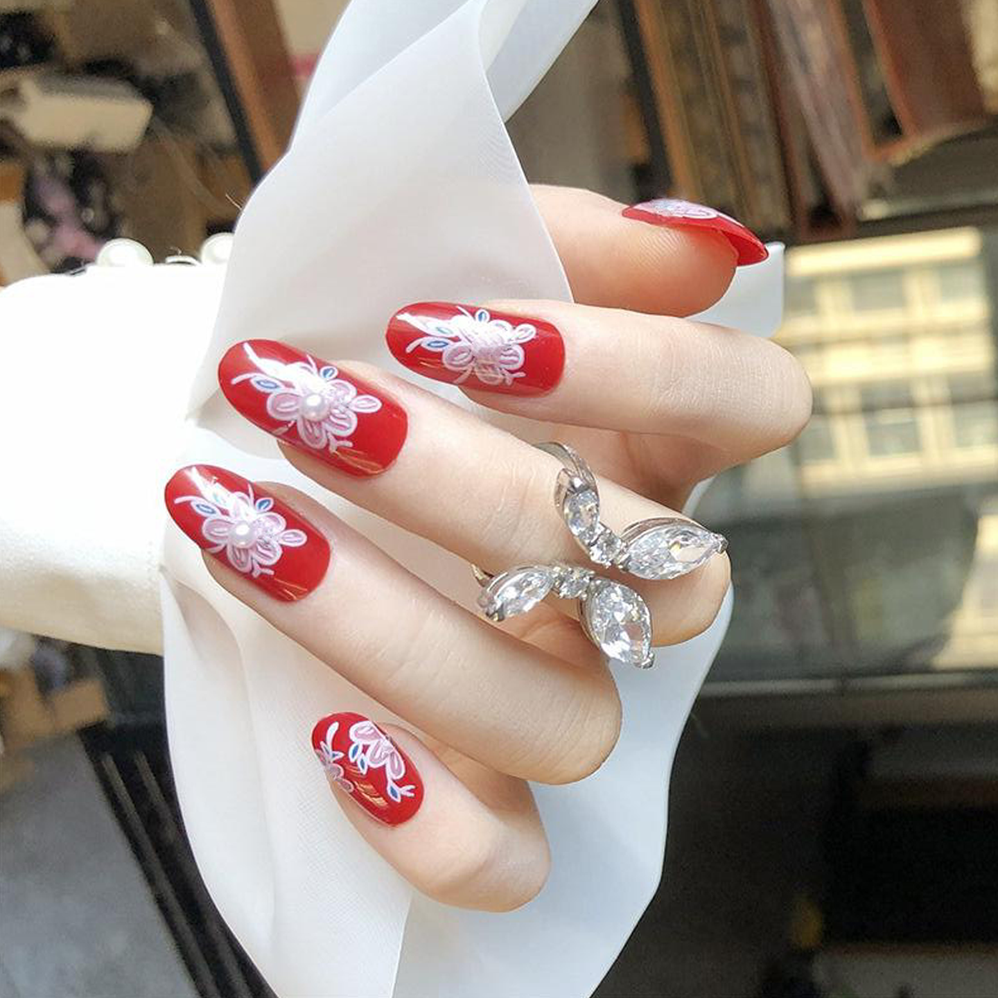 中国风珍珠花朵穿戴甲新年红色假指甲壳古风汉服拍照成品美甲贴片