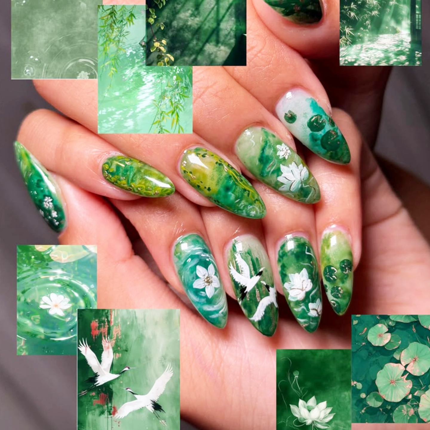 古风鹤影青莲穿戴甲绿色森系荷花假指甲舞蹈拍照国风汉服美甲贴片