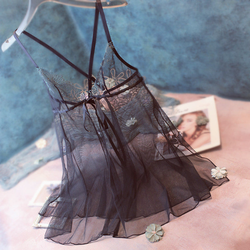 高货质感蕾丝刺绣女性感诱惑超薄网纱睡衣黑色全透明吊带前开睡裙