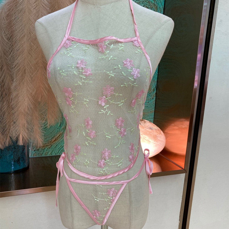 薄纱透明短款吊带睡裙诱惑内衣女纯欲风超薄绣花短裙情调性感睡衣