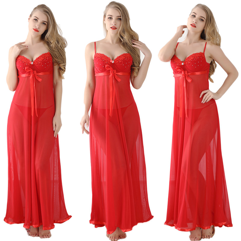 超薄透明性感长裙女吊带薄网纱睡衣套装海棉胸垫诱惑睡裙结婚内衣