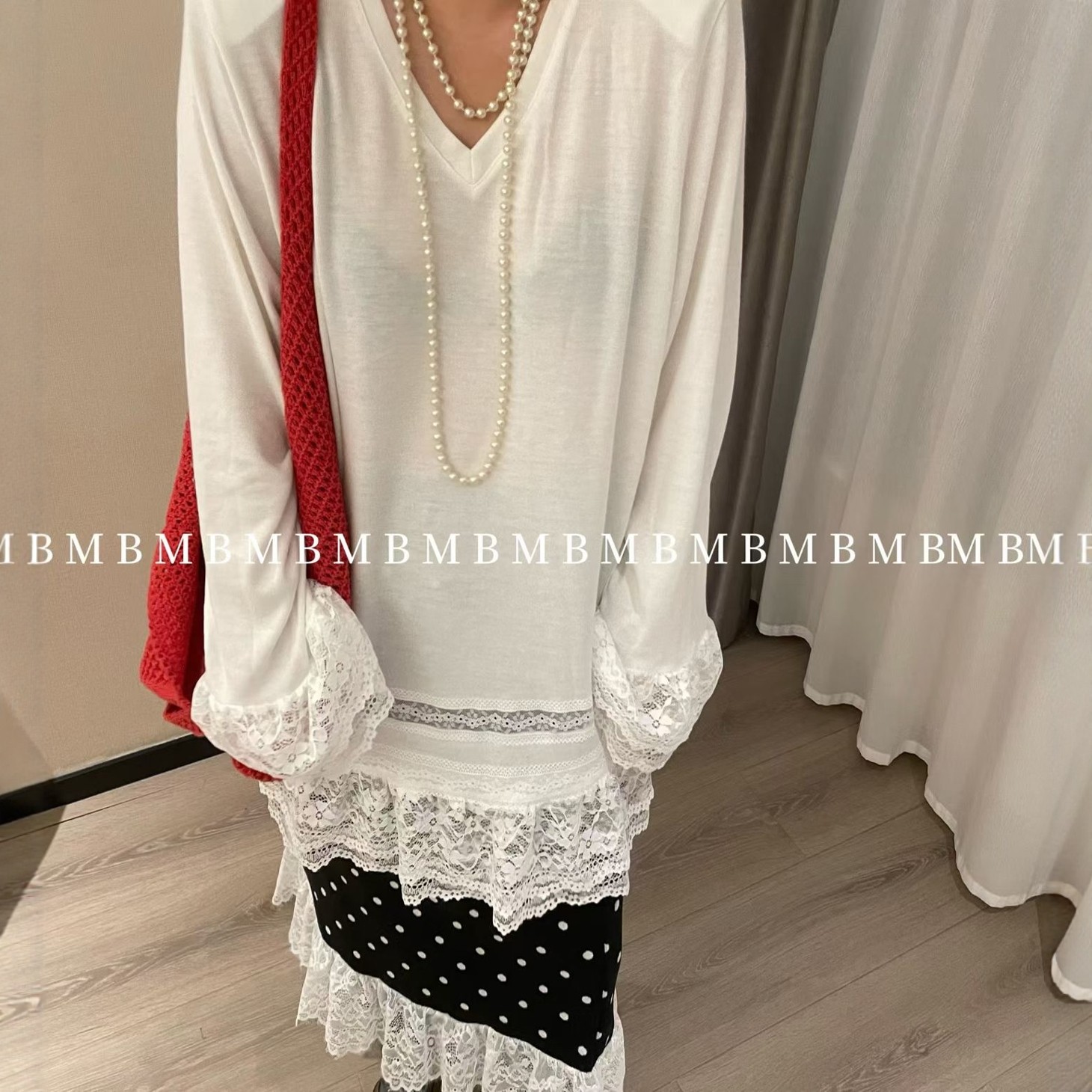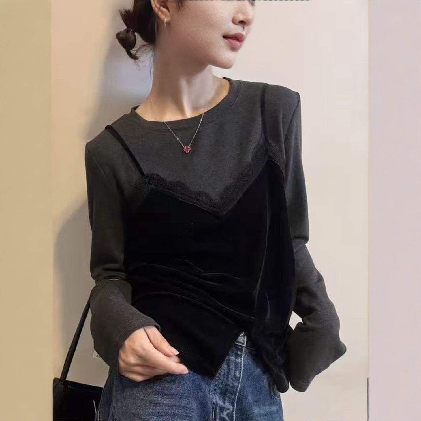 拼蕾丝花边丝绒吊带假两件长袖t恤女2025新款秋季欧洲站打底衫潮
