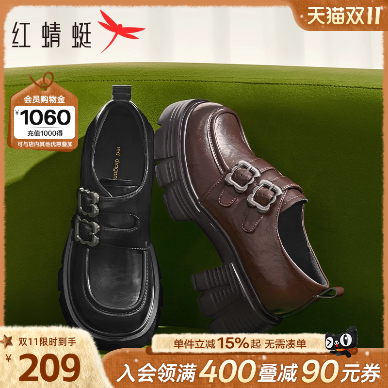红蜻蜓厚底乐福鞋女2025新款女鞋粗跟增高单鞋学院黑色英伦小皮鞋
