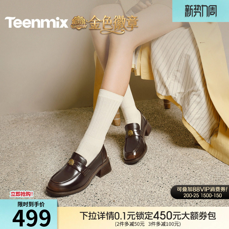 天美意金色徽章英伦学院常青藤乐福鞋平底单鞋女小皮鞋2026春新款