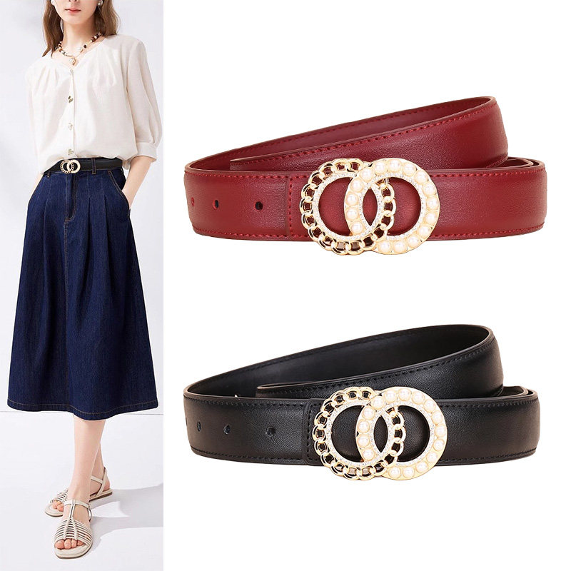 皮带女士真皮平滑扣腰带女装饰双圆环镶珍珠钻石简约百搭西装裤带