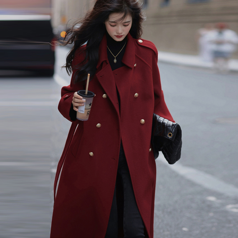 酒红色大衣女2025新款羊毛呢长款大衣女过膝修身双排扣毛呢外套女
