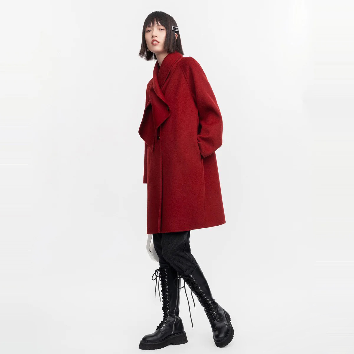 赢智尚酒红色羊毛羊绒大衣女款2025新款独特绝美冬装毛呢厚外套
