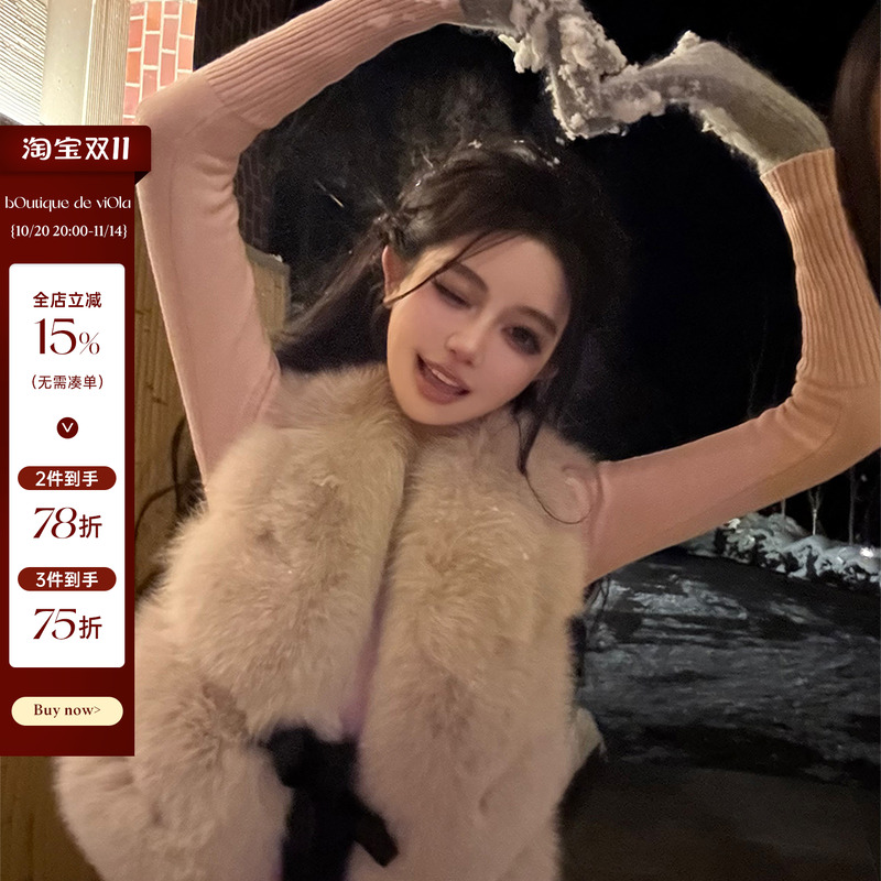 viola 【豆沙少女】Saga拍卖毛料超厚实暖和蝴蝶结狐狸毛马甲女