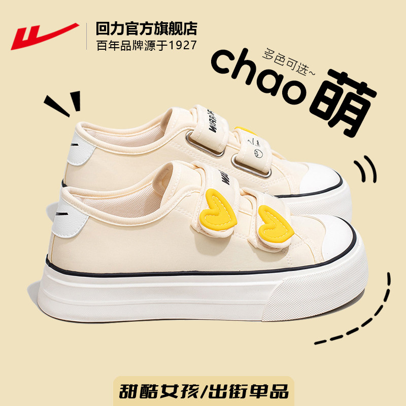 回力厚底帆布鞋女款2026新款春季魔术贴小白鞋配裙子透气休闲板鞋