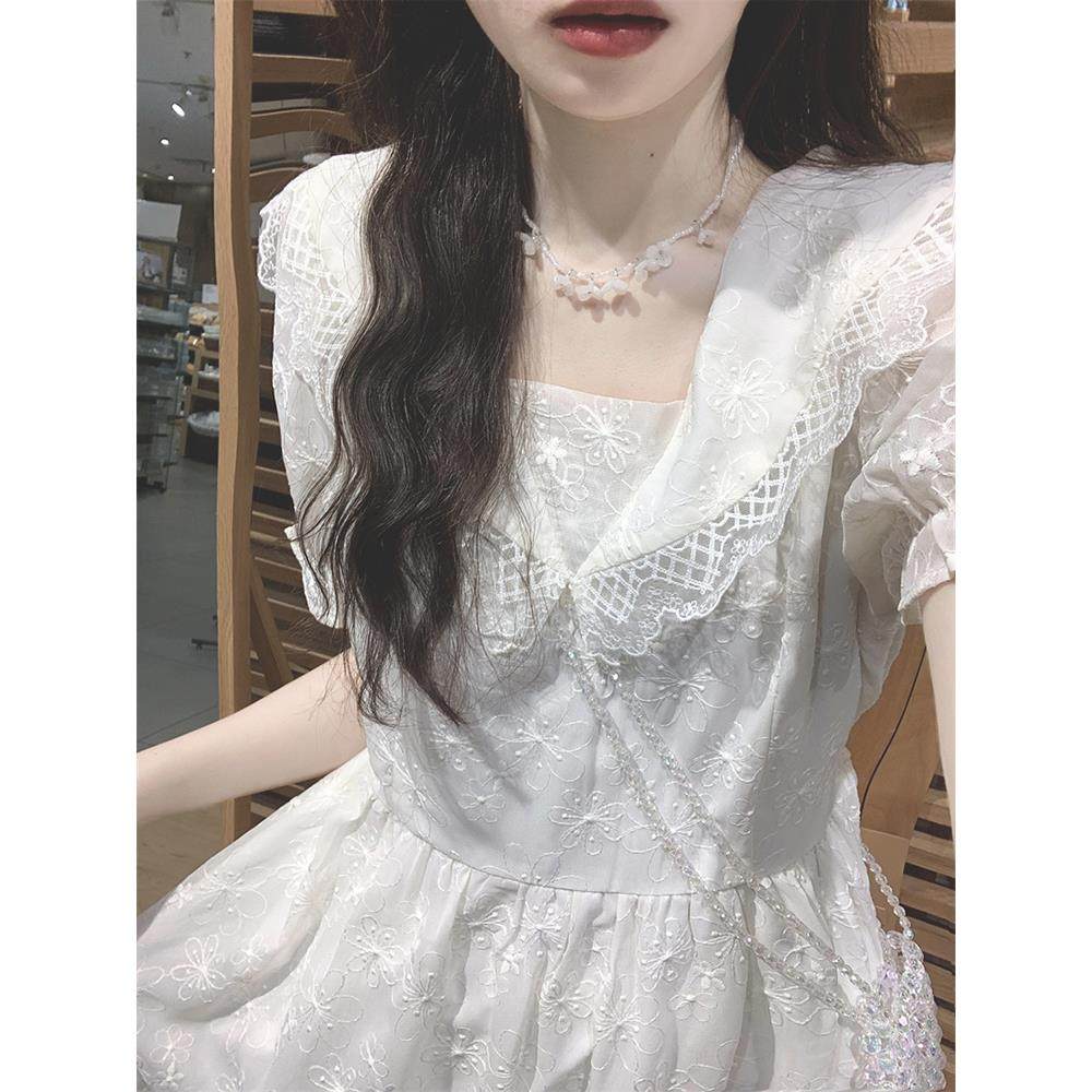 茶歇在逃公主长裙女夏季温柔风法式初恋甜美娃娃领蕾丝高腰连衣裙