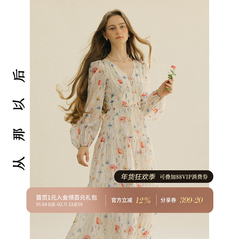 从那以后法式茶歇连衣裙长袖碎花裙高级感蛋糕裙子公主长裙女早秋