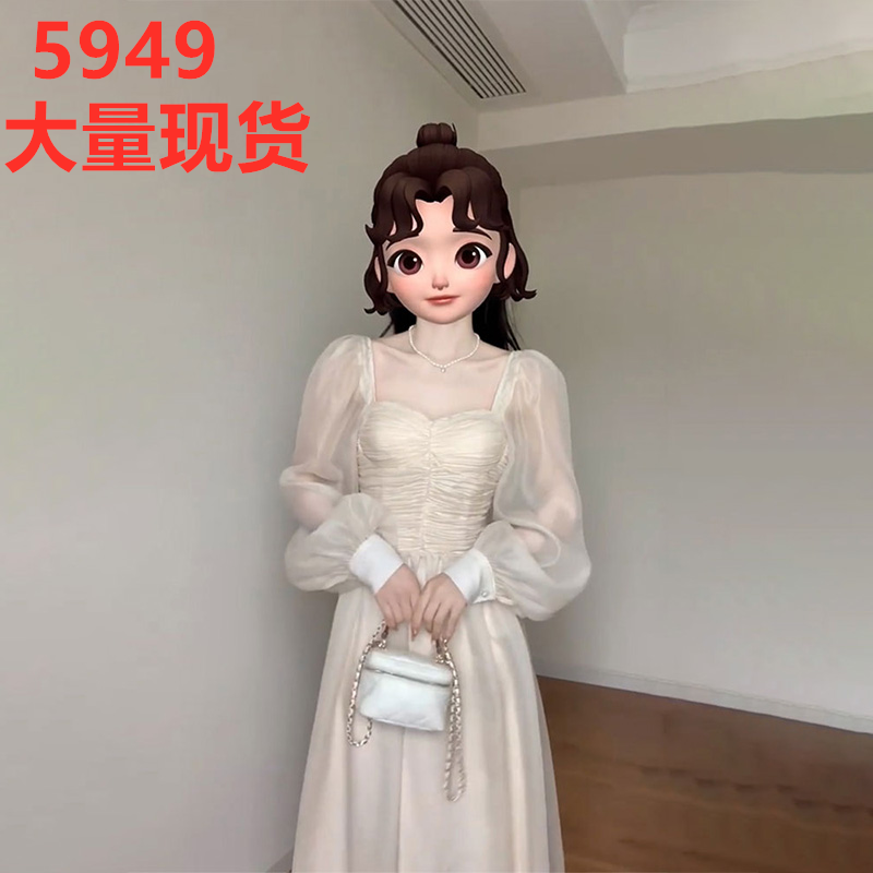 法式气质温柔风方领重工大裙摆网纱长袖连衣裙女春秋新款公主长裙