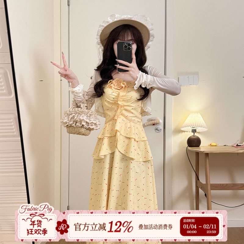 织物猪 浪漫春野 甜美风法式黄色波点吊带连衣裙女夏收腰公主长裙