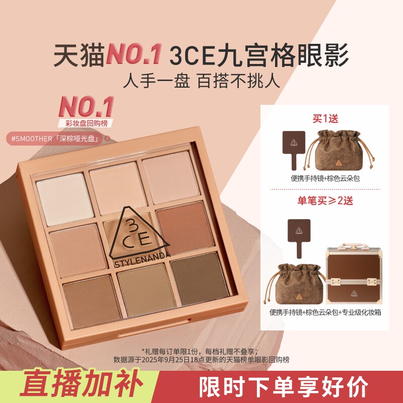 【达人直播】3CE 九宫格眼影哑光橘棕盘芋泥盘海盐面包大地色NHO