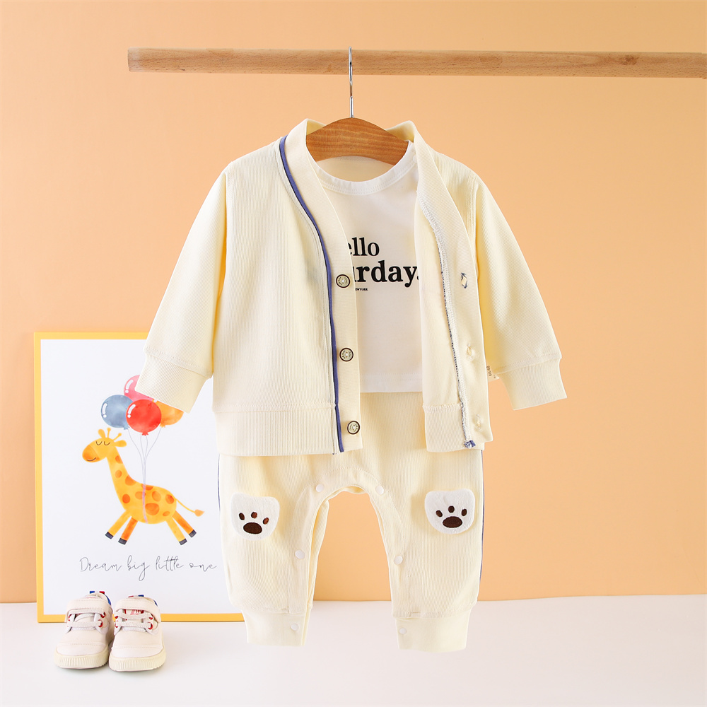 春秋新款针织衫女男宝宝外套V领外川开衫纯棉T恤高腰免脱裤三件套
