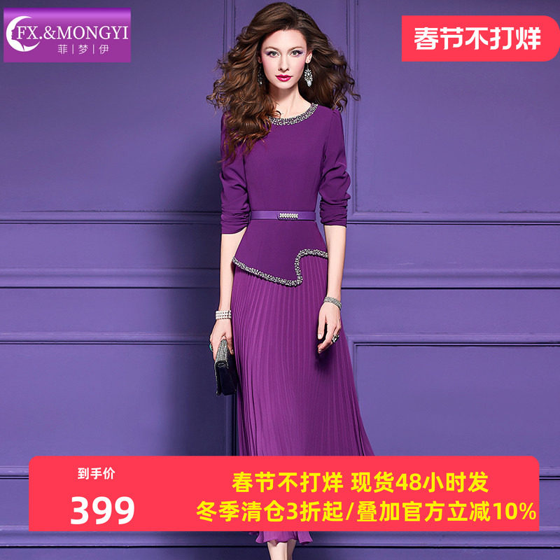 菲梦伊原创钉珠紫色连衣裙女长袖秋装别致独特绝美收腰百褶长裙子