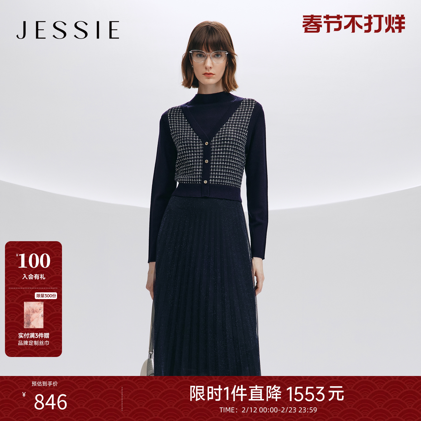 JESSIE千鸟格假两件连衣裙女粗花呢收腰拼接百褶长裙25年冬季新款