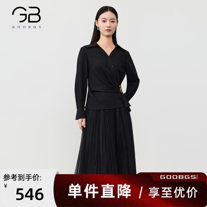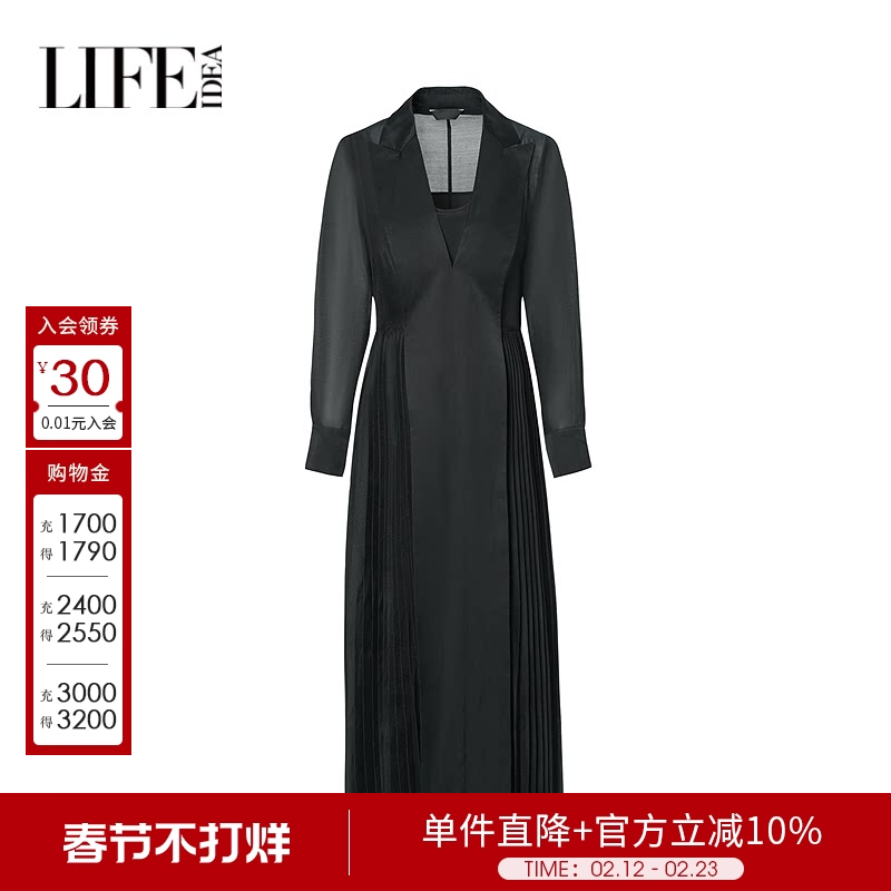 LANCY/朗姿2025秋新款知性高级感长袖衬衫百褶连衣裙A字中长裙子