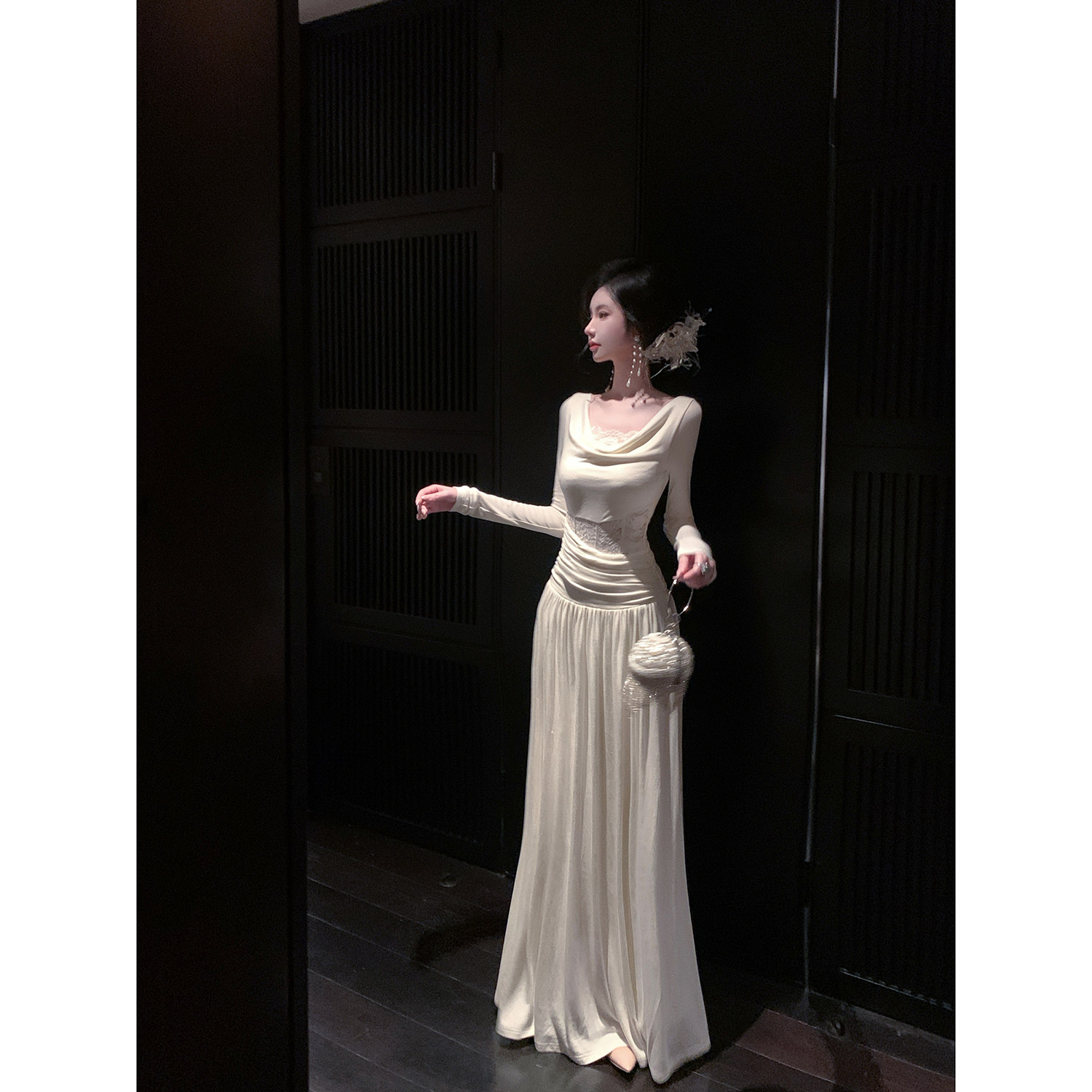 秋冬百褶裙2025春新款淑女装气质修身A字裙长袖中长款打底连衣裙