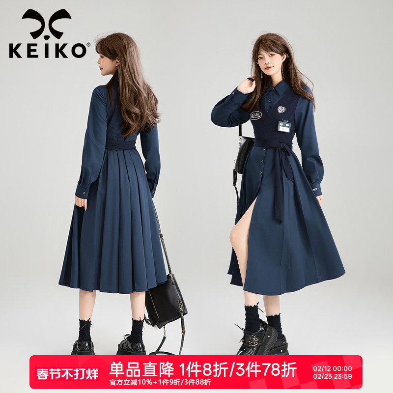 KEIKO高知风假两件式衬衫连衣裙春季通勤系带收腰显瘦A字百褶长裙