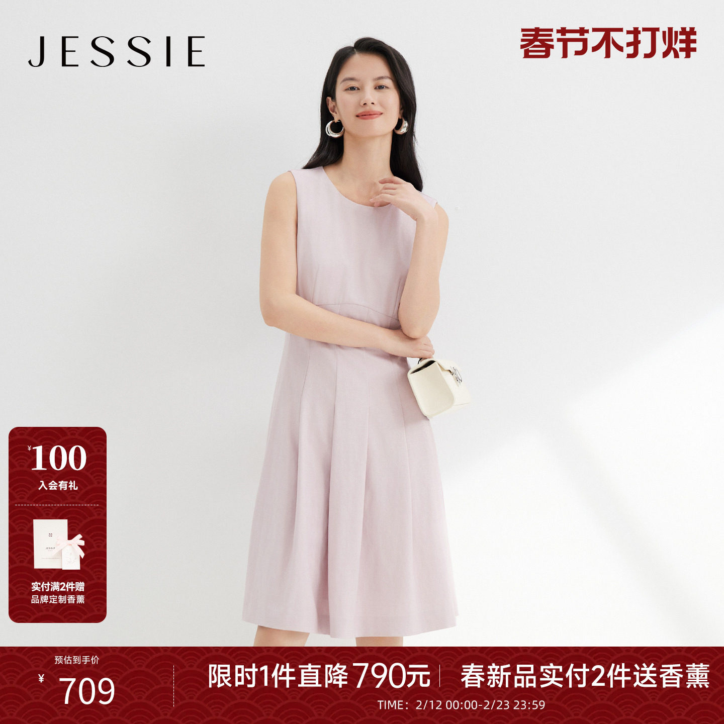 JESSIE知性风收褶无袖连衣裙女气质圆领中长百褶裙2026年春季新款