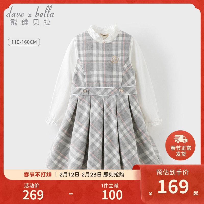 戴维贝拉女童背心裙儿童格子连衣裙新款春季女孩百褶裙子童装长裙