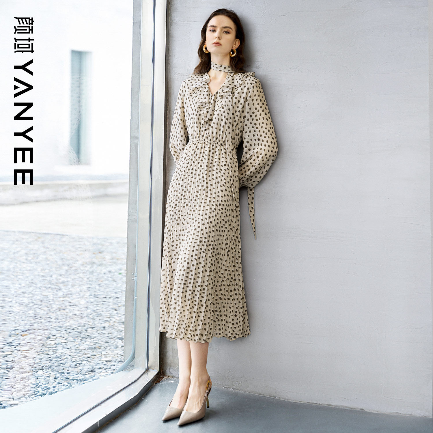 颜域法式复古波点连衣裙女2026春新款荷叶边收腰名媛气质百褶长裙