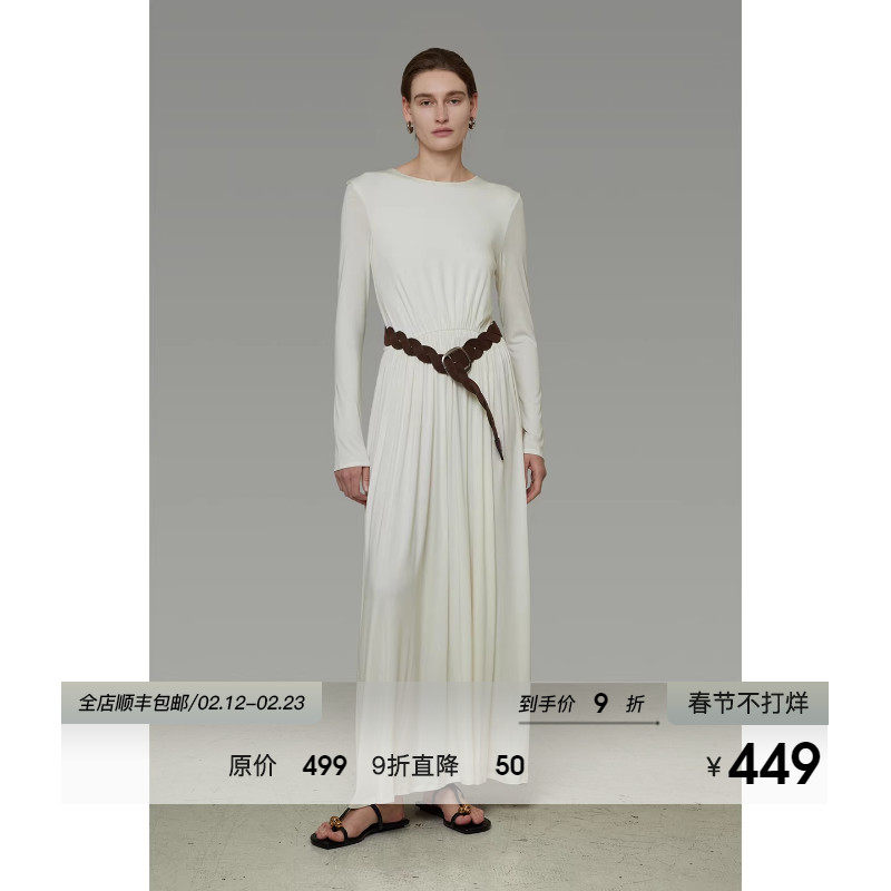 UNSPOKEN白色修身百褶长裙气质编织宽腰带简约显瘦高级感连衣裙女