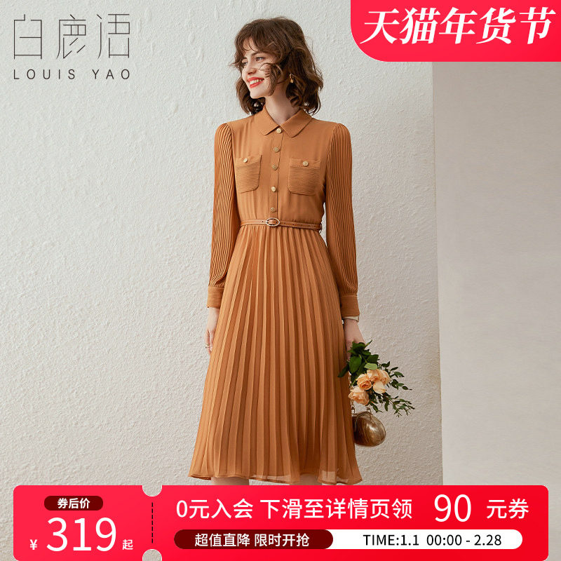 白鹿语ol风气质压褶百褶裙长裙春夏法式优雅通勤翻领长袖连衣裙
