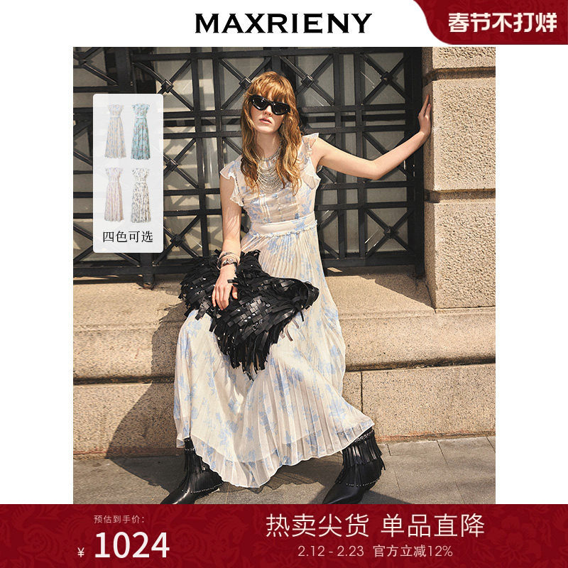 MAXRIENY蓝星花连衣裙25夏款优雅百褶小飞袖裙子气质感收腰长裙