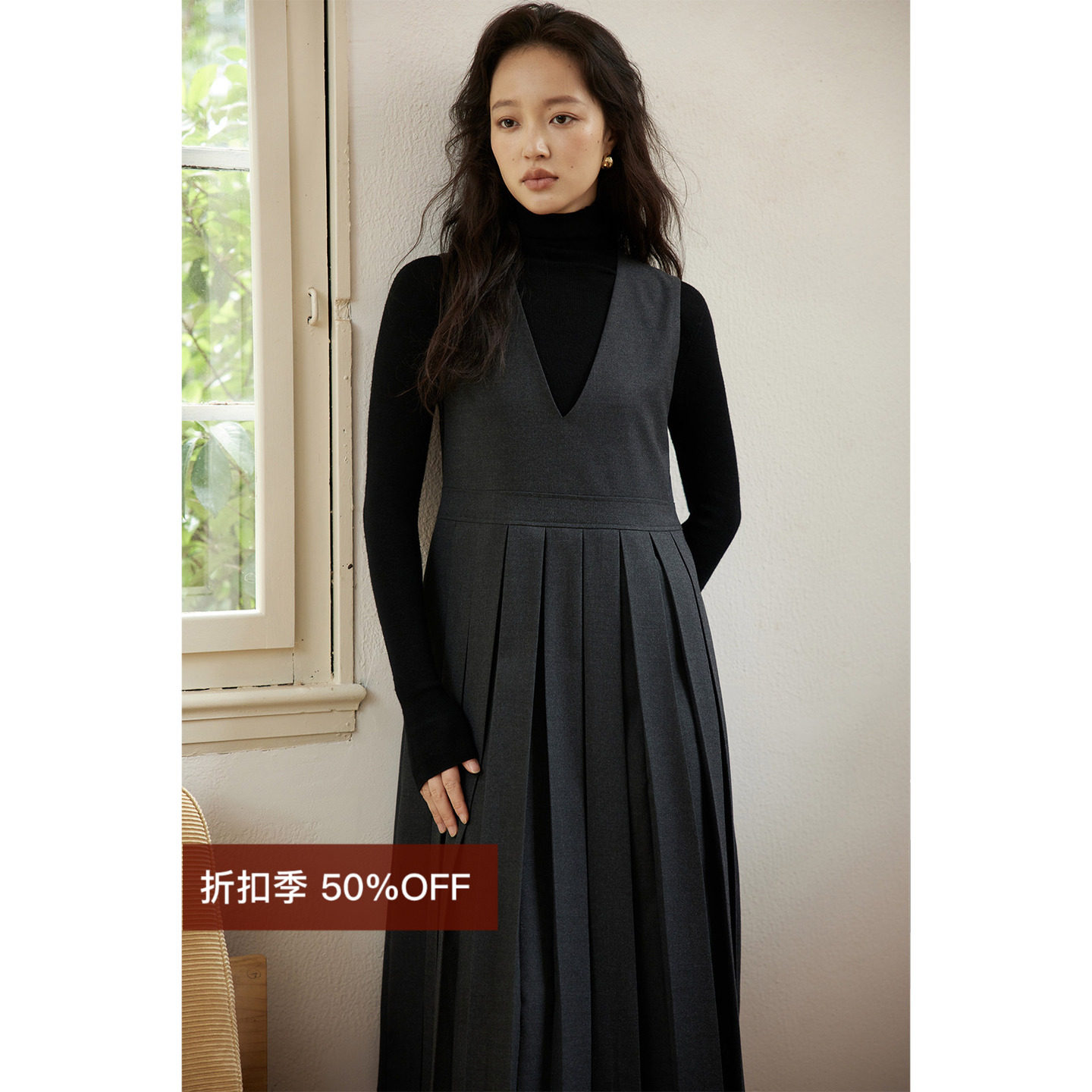 【断码清仓5折】百搭通勤百褶叠穿中长款深灰马甲连衣裙 芝美日禾