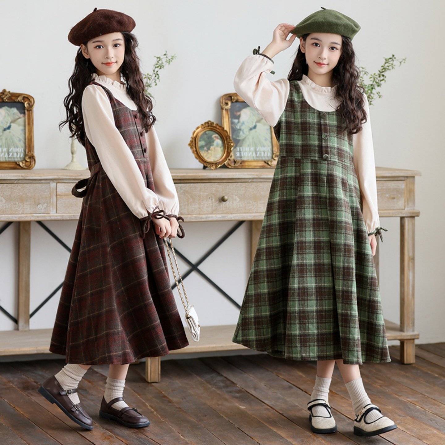 女童加绒连衣裙秋冬2025新款洋气时髦中大童长裙子女孩格子百褶裙