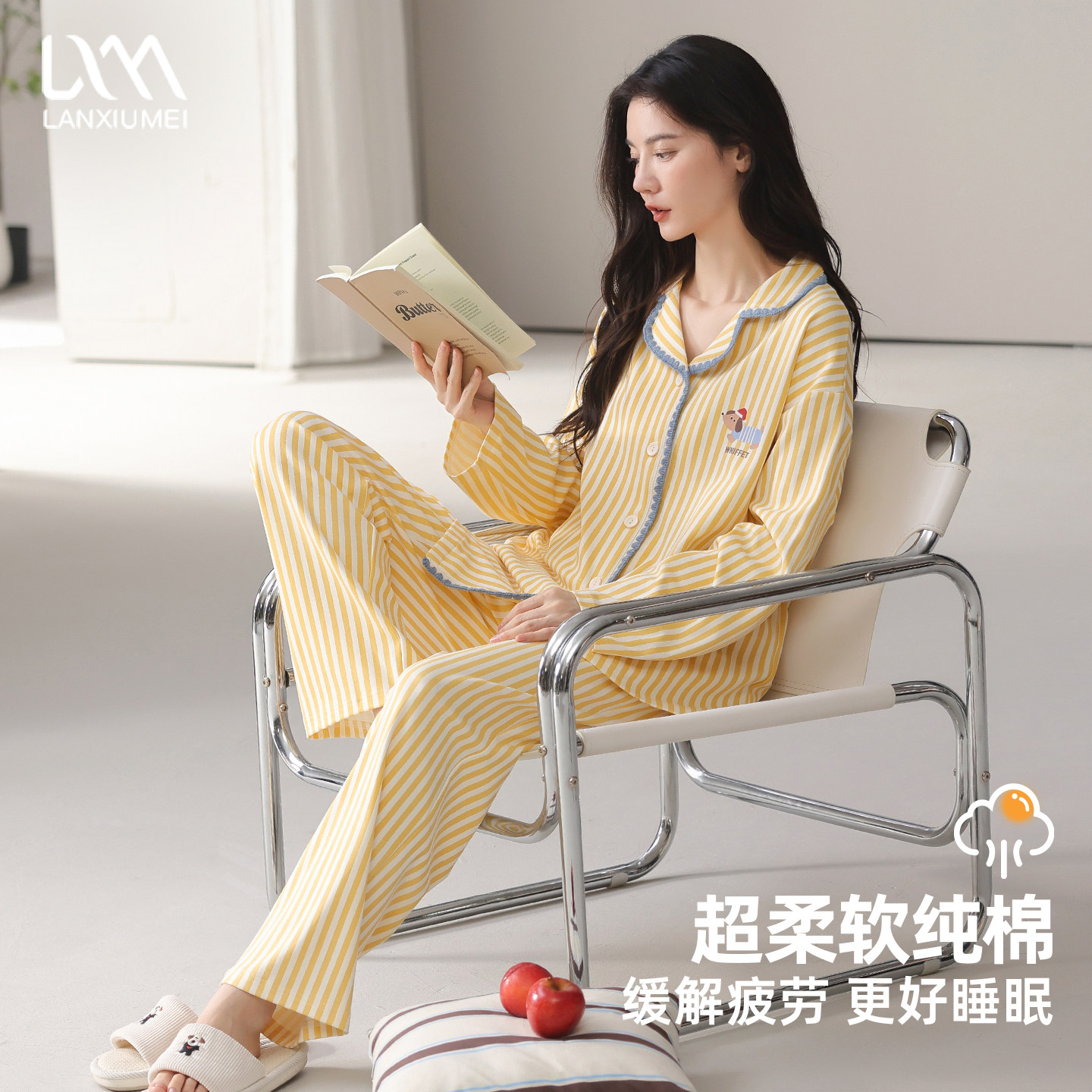 浪莎纯棉睡衣女春秋季开衫长袖卡通可爱女生家居服套装秋冬可外穿