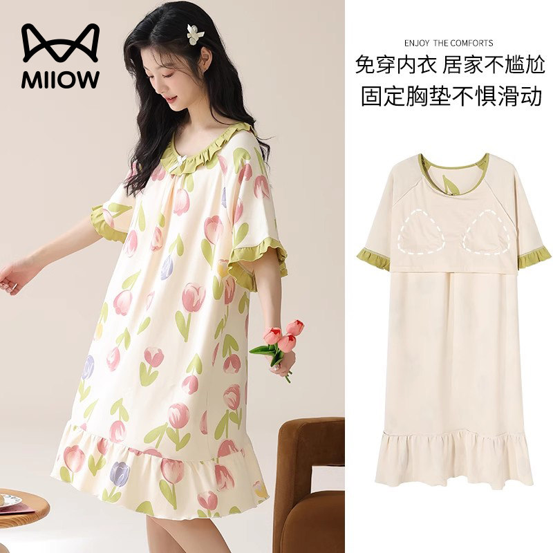 猫人睡裙夏季女款2024新款纯棉孕妇连衣裙带胸垫夏天女生睡衣甜美