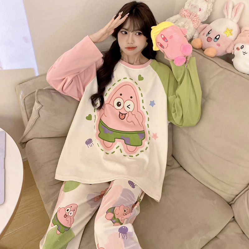芬腾女生睡衣春秋季纯棉圆领长袖套装可爱休闲宽松大码家居服春天